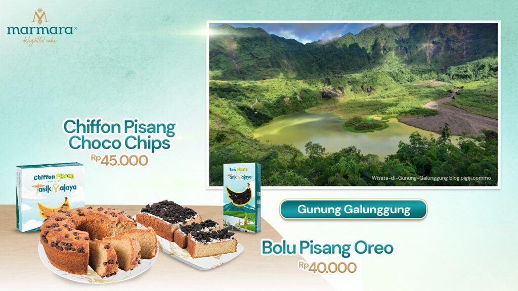 Gunung Galunggung menawarkan pesona alam yang luar biasa, mulai dari kawah hingga pemandian air panas. Setelah menikmati trekking atau mandi air panas, lengkapi perjalanan Anda dengan Marmara Chiffon Pisang Choco Chips dan Bolu Pisang Oreo, pilihan tepat untuk mengisi tenaga.