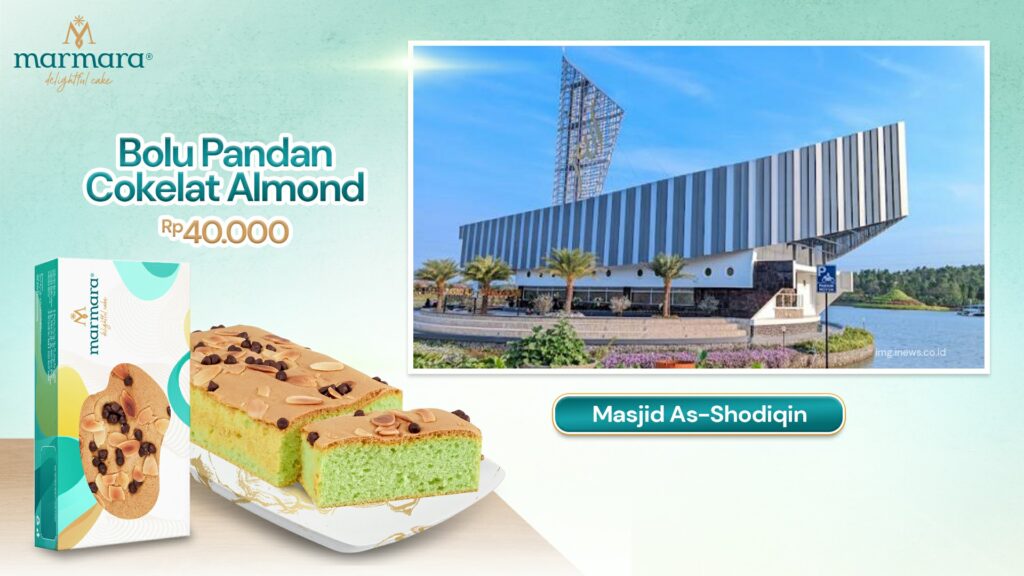 Destinasi unik ini memiliki desain masjid berbentuk perahu yang penuh filosofi. Rasakan pengalaman wisata religi yang berbeda di sini. Setelah berkeliling, nikmati Marmara Bolu Pandan Cokelat Almond sebagai pengisi energi dengan cita rasa manis pandan yang memanjakan.