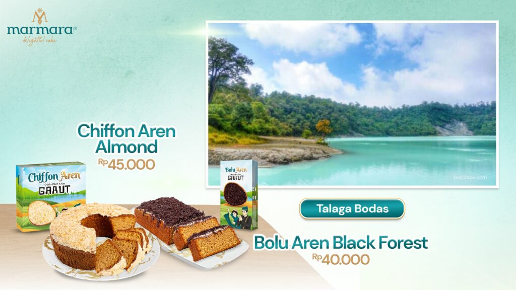 Keindahan Talaga Bodas dengan kawah putihnya akan memukau siapa saja yang datang. Sambil menikmati pemandangan eksotis ini, pastikan Happiness Seeker membawa Marmara Chiffon Aren Almond dan Bolu Aren Black Forest, dengan manis otentik dari Aren yang khas menyempurnakan suasana.