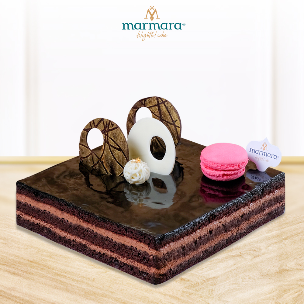 Premium 4 layer chocolate cake dengan mousse lembut & glaze glossy. Rich, balance, dan super lembut.